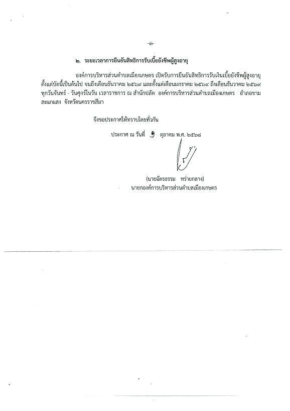 ประกาศการรับยืนยันสิทธิรับเงินเบี้ยยังชีพผู้สูงอายุของ อบต.เมืองเกษตร ประจำปีงบประมาณ พ.ศ. 2569-2570