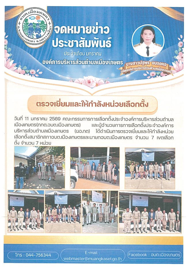 วันที่ 11 มกราคม 2569 คณะกรรมการการเลือกตั้งประจำองค์การบริหารส่วนตำบลเมืองเกษตร (กกต.อบต.เมืองเกษตร)และผู้อำนวยการการเลือกตั้งประจำองค์การบริหารส่วนตำบลเมืองเกษตร(ผอ.กต) ได้ดำเนินการตรวจเยี่ยมและให้กำลังหน่วยเลือกตั้งสมาชิกสภาอบต.เมืองเกษตรและนายกอบต.เมืองเกษตร