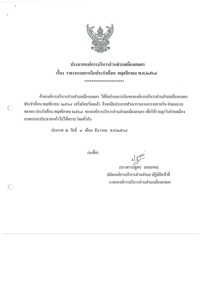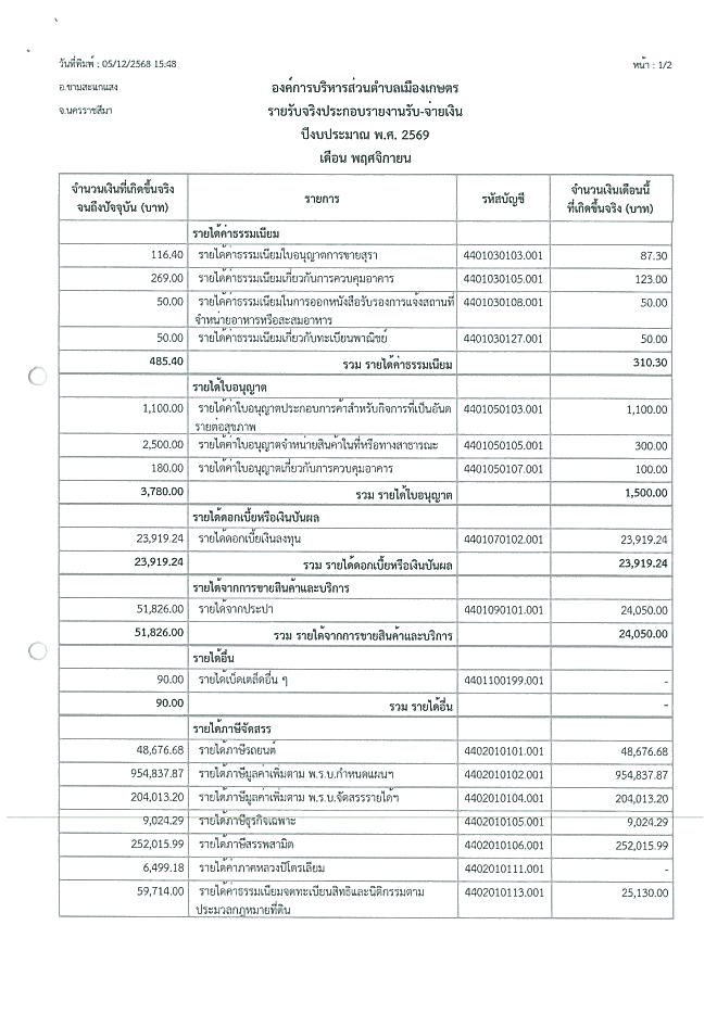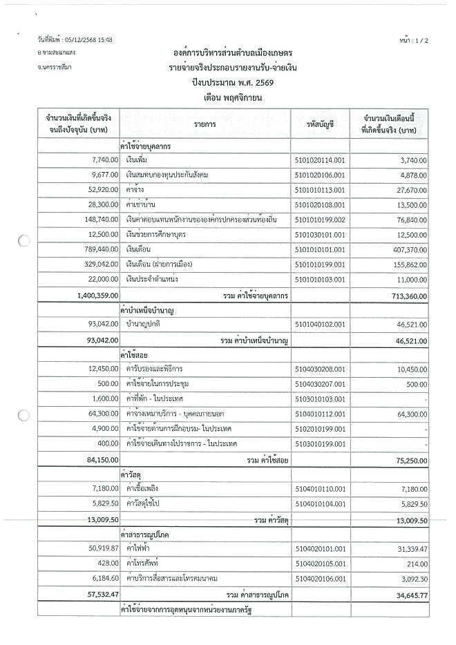 รายงานงบการเงินประจำเดือน พฤศจิกายน 2568