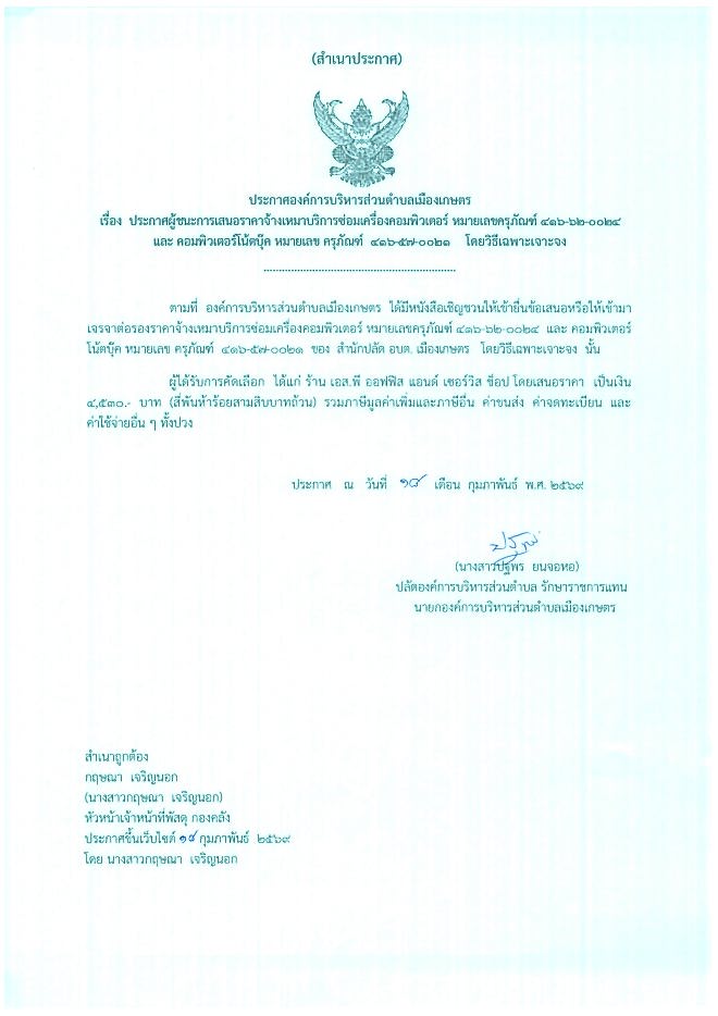 ประกาศผู้ชนะเสนอราคาจ้างเหมาบริการซ่อมเครื่องคอมพิวเตอร์ หมายเลขครุภัณฑ์ 416-62-0024 และ คอมพิวเตอรืโน้ตบุ๊ค หมายเลขครุภัณฑ์ 416-57-0021 โดยวิธีเฉพาะเจาะจง