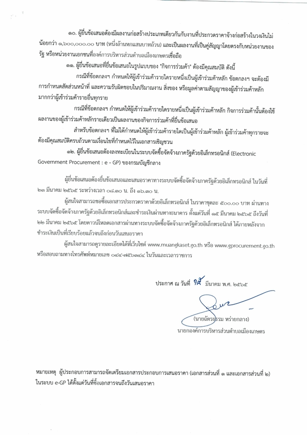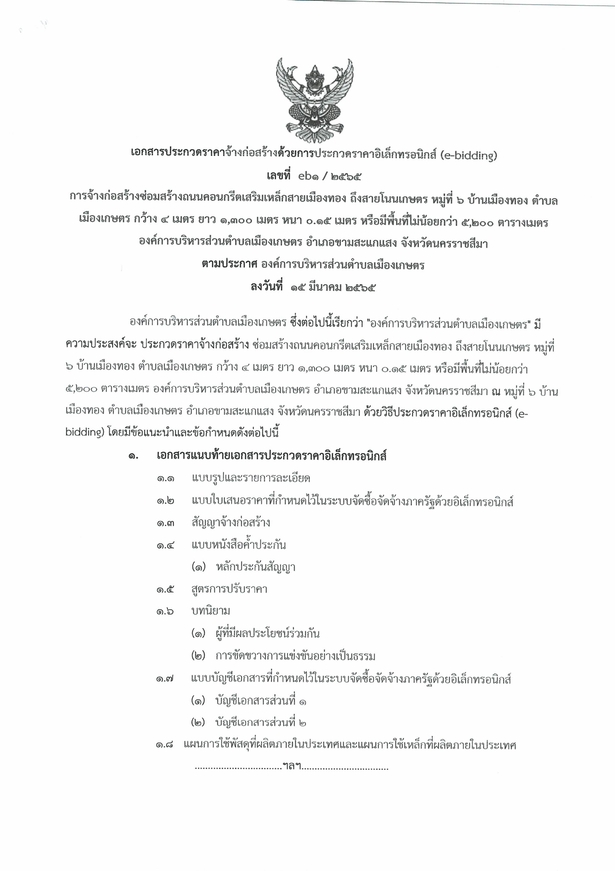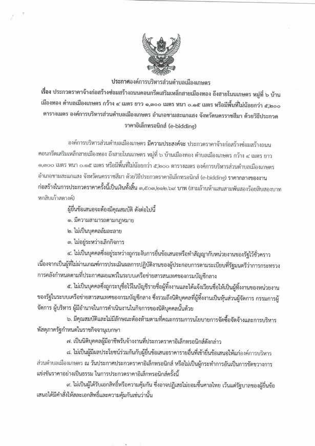 ประกาศประกวดราคาจ้างก่อสร้างซ่อมสร้างถนน คสล. สายเมืองทอง ถึงสายโนนเกษตร ม.6