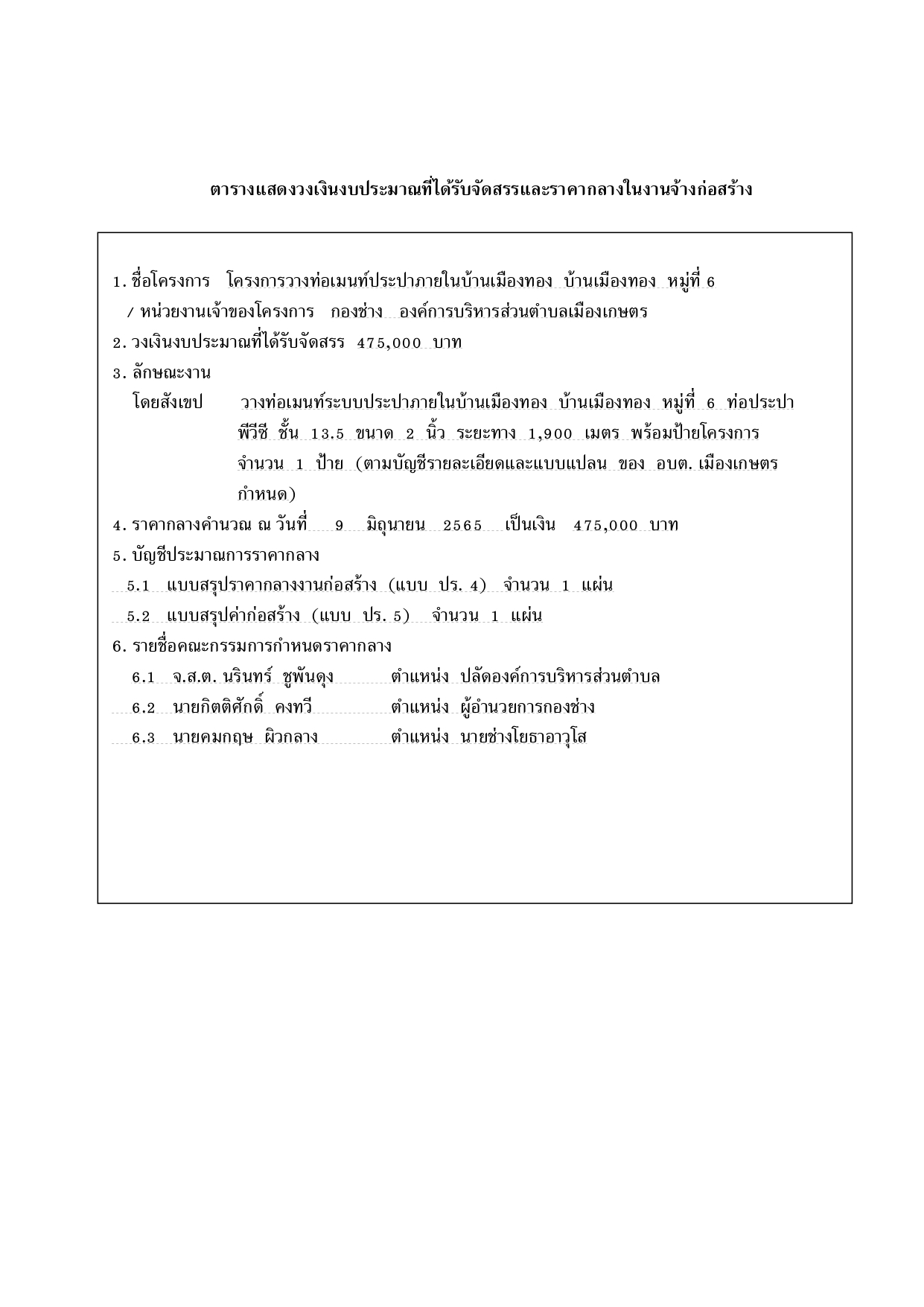 ตารางแสดงวงเงินงบประมาณ ฯ โครงการวางท่อเมนท์ประปาภายในบ้านเมืองทอง ม.6