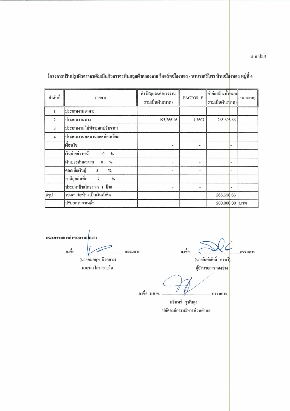 ราคากลาง โครงการปรับปรุงผิวจราจรเดิมเป็นผิวจราจรหินคลุกฝั่งคลองฯ บ้านเมืองทอง ม6