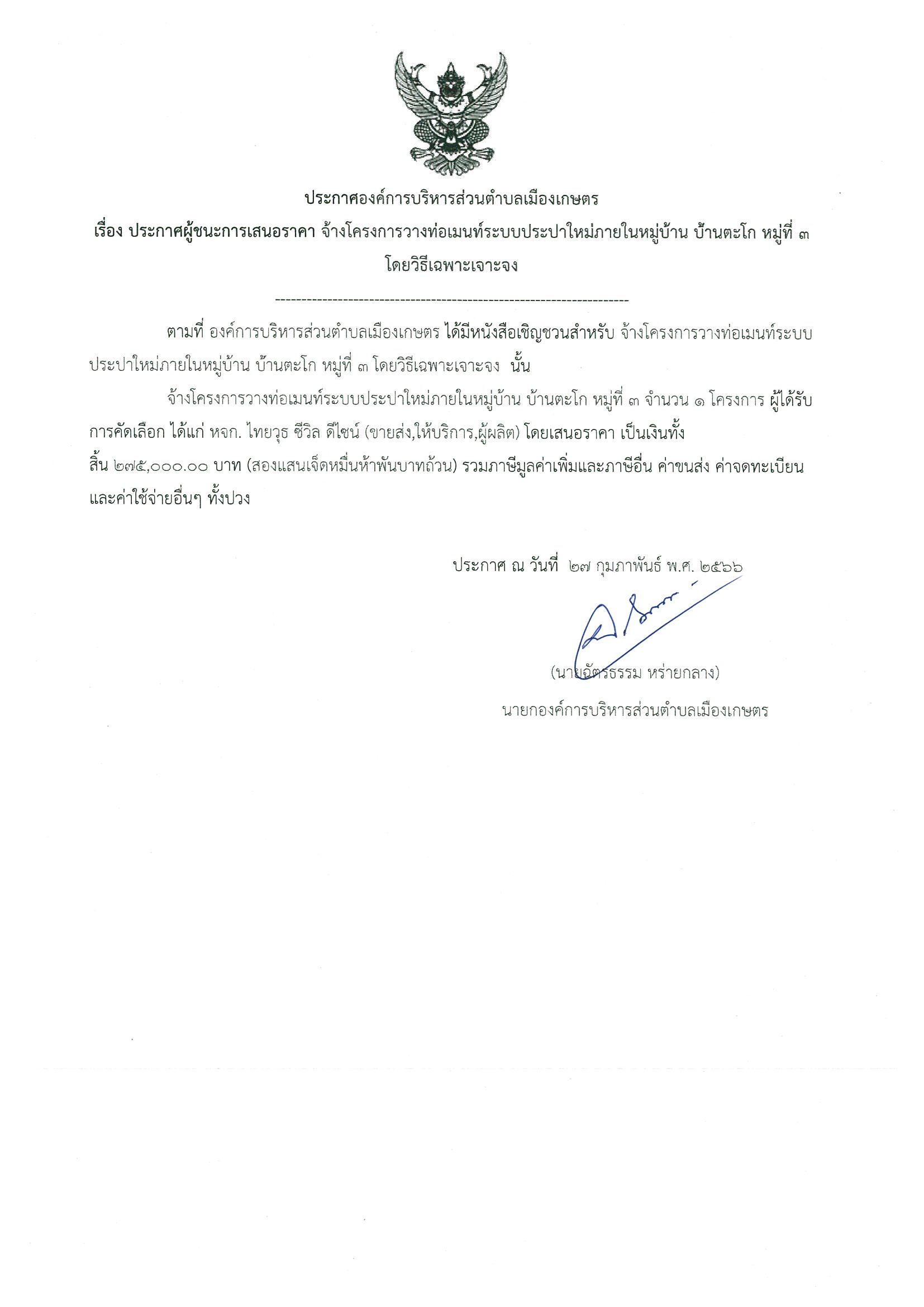 ประกาศผู้ชนะการเสนอราคา จ้างโครงการวางท่อเมนท์ระบบประปา หมู่ที่ ๓