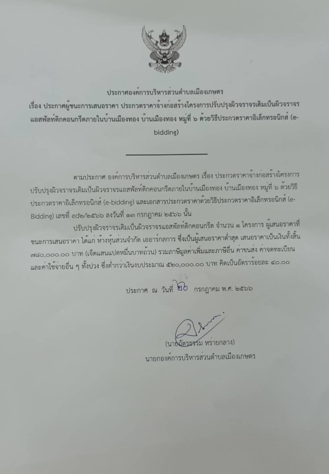 ประกาศผู้ชนะเสนอราคา ประกวดราคาจ้างก่อสร้างโครงการปรับปรุงผิวจราจรเดิมเป็นผิวจราจรแอสฟัลท์ติกคอนกรีตภายในบ้านเมืองทอง (e-bidding)