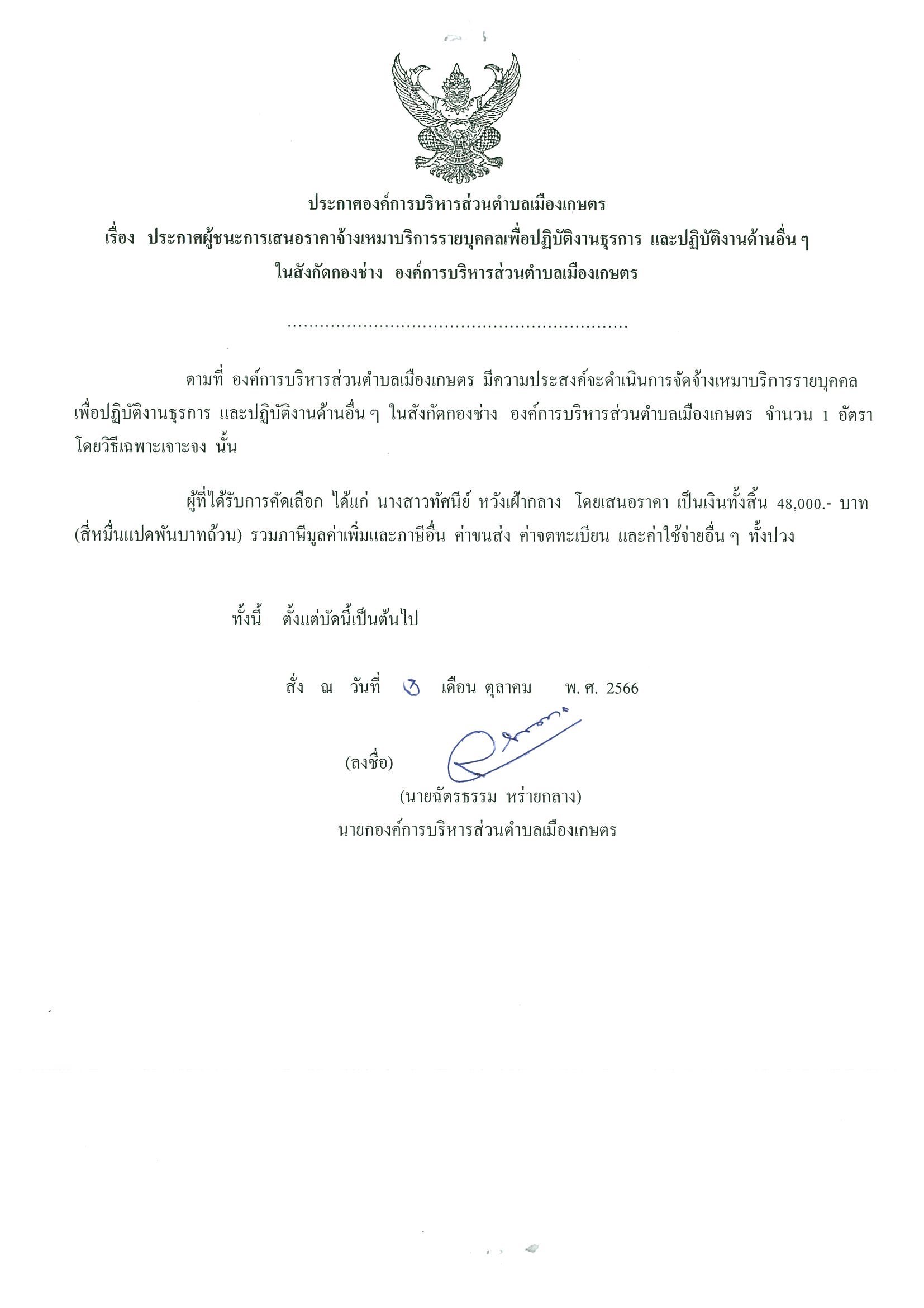ประกาศผู้ชนะเสนอราคาจ้างเหมาบริการรายบุคคลเพื่อปฏิบัติงานธุรการ และปฏิบัติงานด้านอื่นๆ