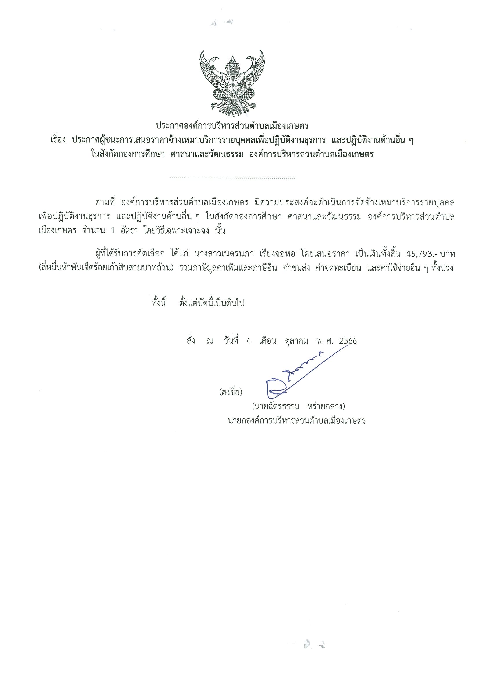 ประกาศผู้ชนะเสนอราคาจ้างเหมาบริการรายบุคคลเพื่อปฏิบัติงานธุรการ และปฏิบัติงานด้านอื่นๆ สังกัดกองการศึกษา ศาสนาและวัฒนธรรม