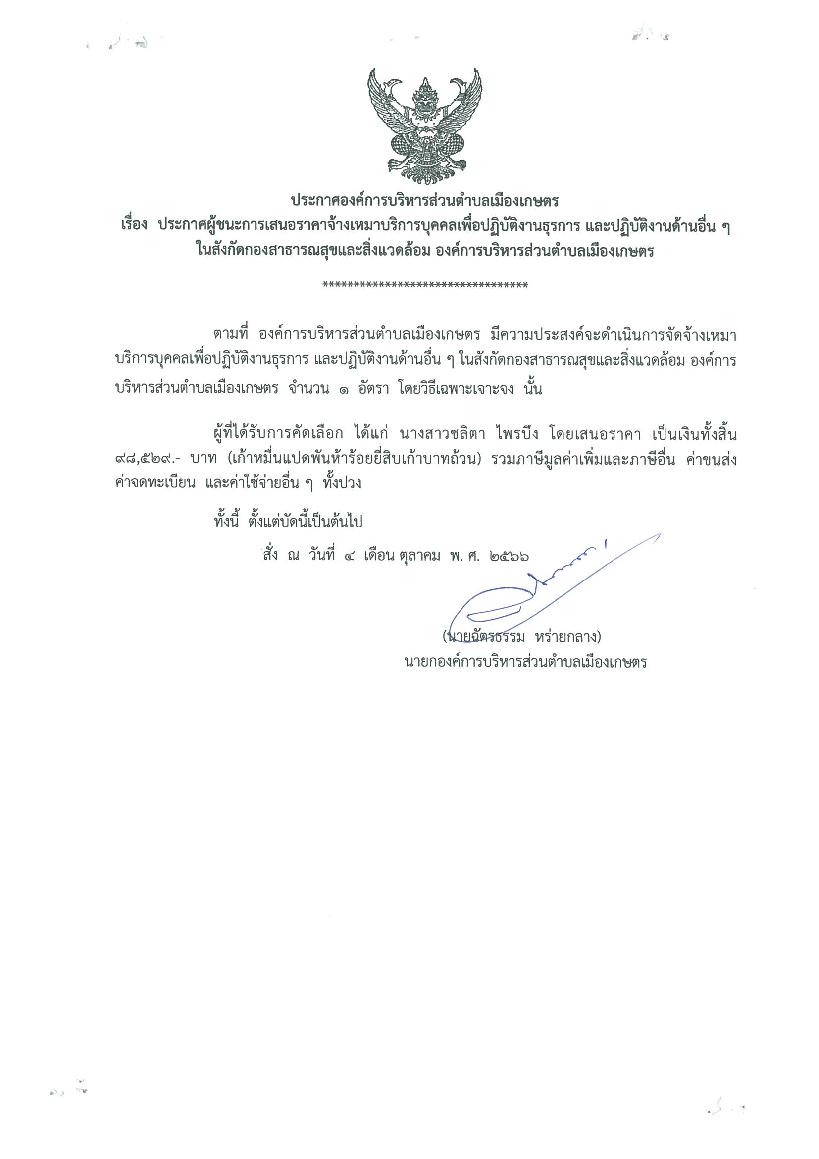 ประกาศผู้ชนะเสนอราคาจ้างเหมาบริการรายบุคคลเพื่อปฏิบัติงานธุรการ และปฏิบัติงานด้านอื่นๆ ในสังกัดกองสาธารณสุขและสิ่งแวดล้อม