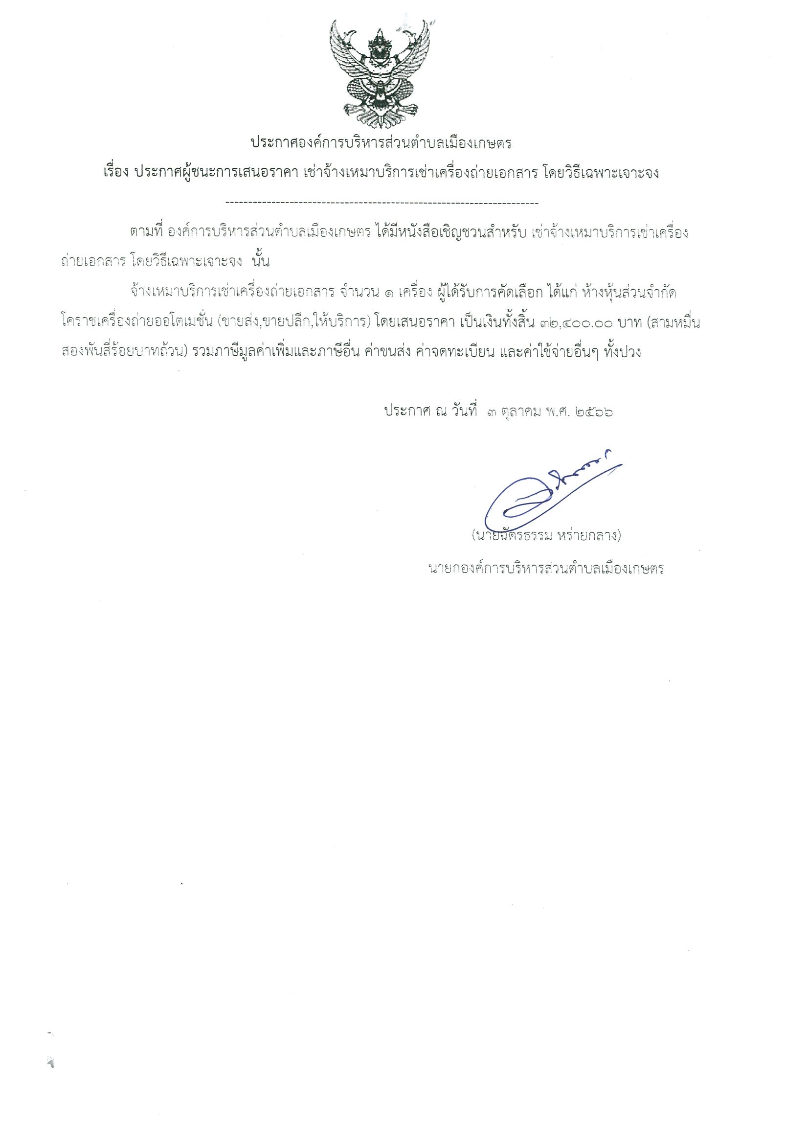 ประกาศผู้ชนะการเสนอราคา เช่าจ้างเหมาบริการเช่าเครื่องถ่ายเอกสาร