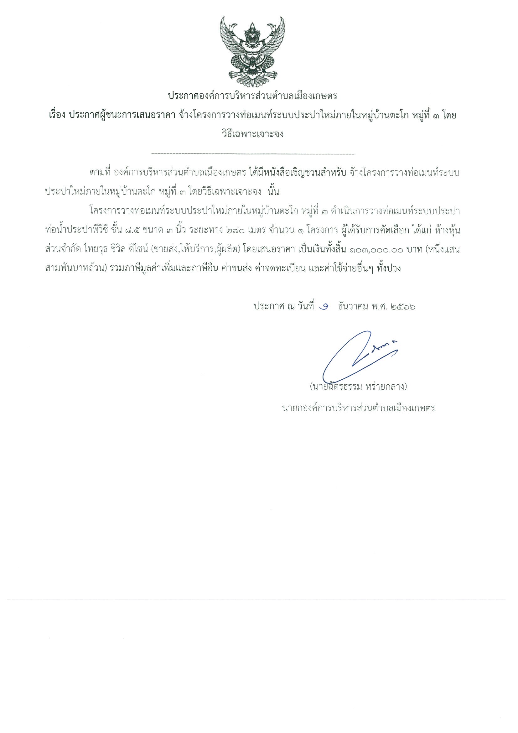 ประกาศผู้ชนะการเสนอราคา โครงการวางท่อเมนท์ระบบประปาใหม่บ้านตะโก โดยวิธีเฉพาะเจาะจง