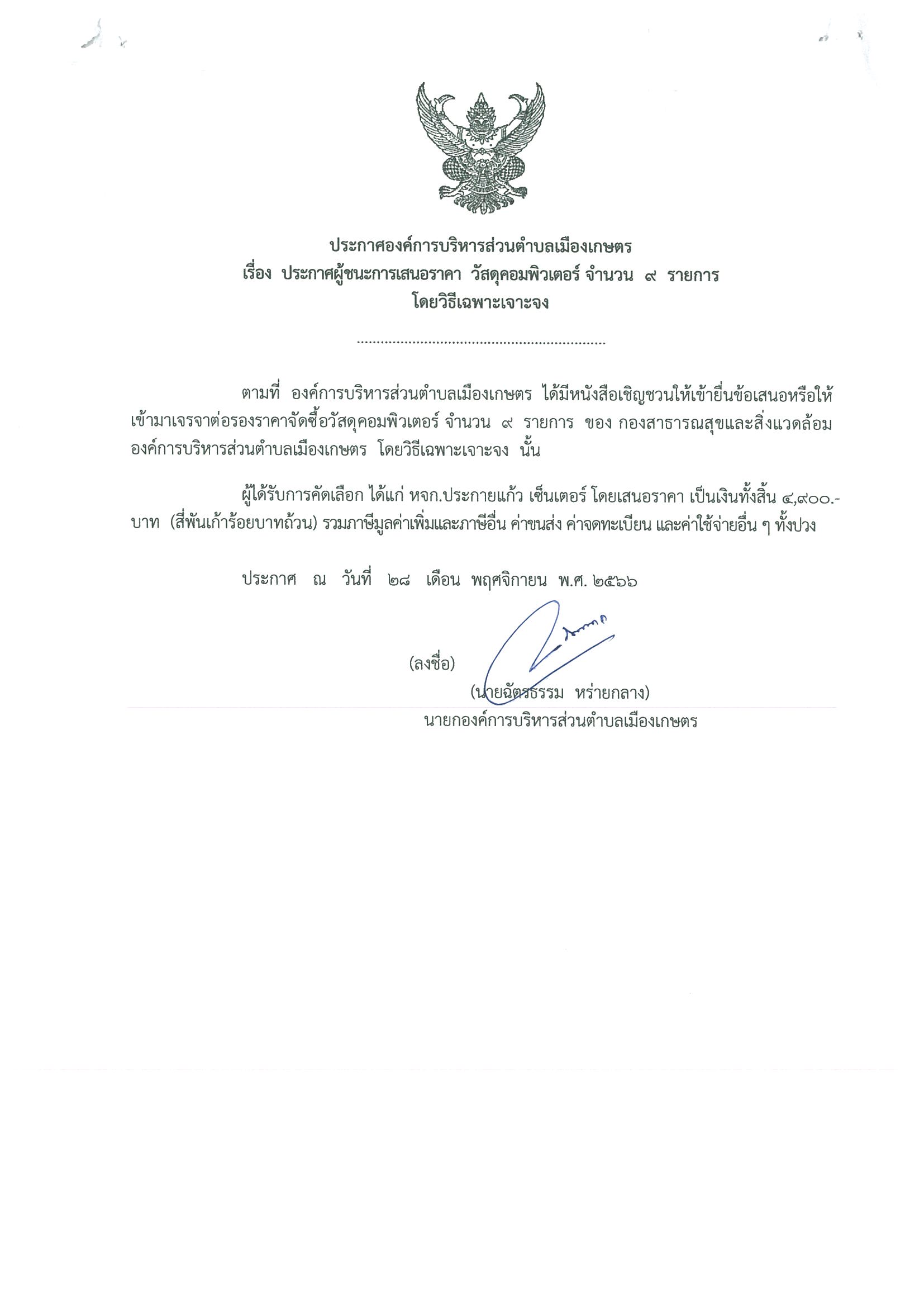 ประกาศผู้ชนะการเสนอราคา วัสดุคอมพิวเตอร์ 9 รายการ โดยวิธีเฉพาะเจาะจง