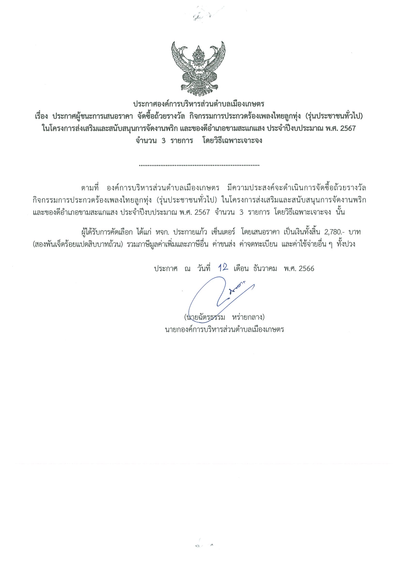 ประกาศผู้ชนะการเสนอราคา จัดซื้อถ้วยรางวัลกิจกรรมการประกวดร้องเพลงไทยลูกทุ่ง จำนวน 3 รายการ