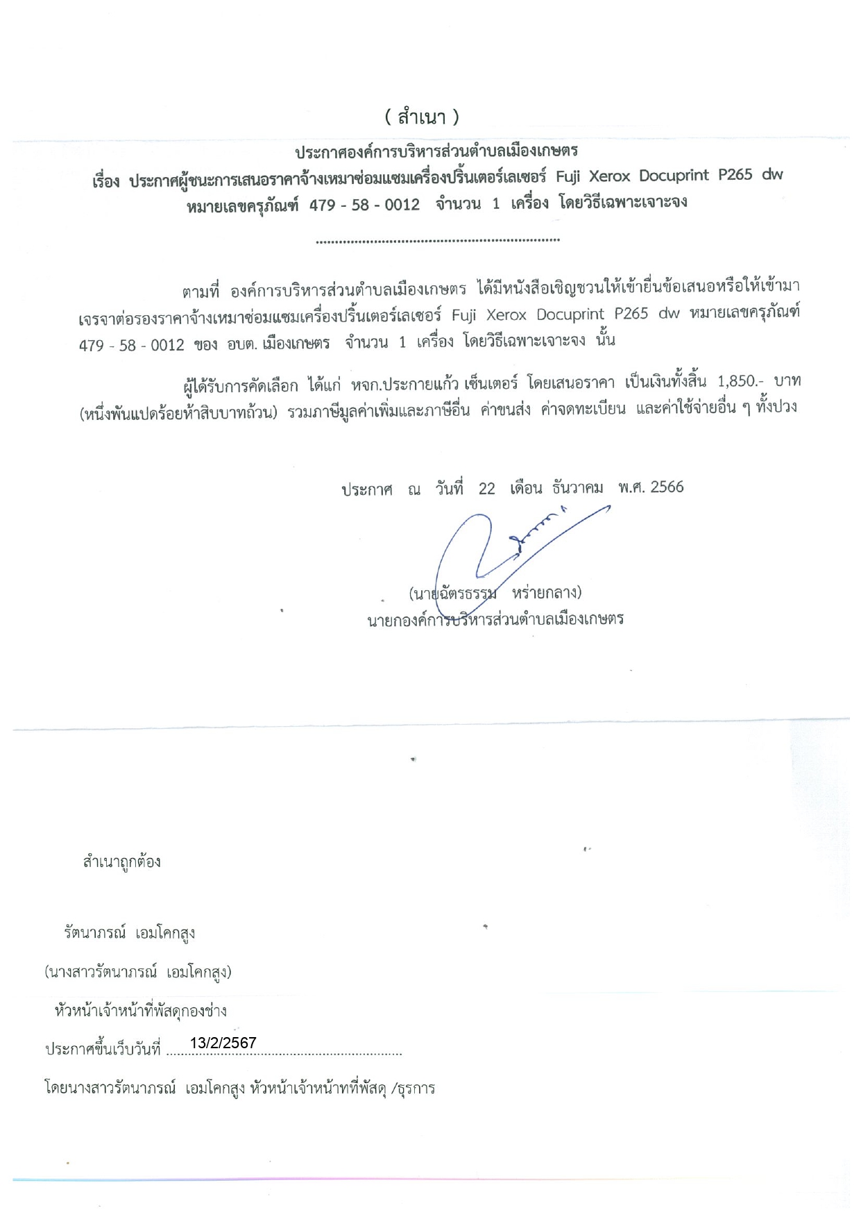 ประกาศผู้ชนะการเสนอราคาจ้างเหมาซ่อมแซมเครื่องปริ้นเตอร์ fuji Xerox Docuprint P265 dw