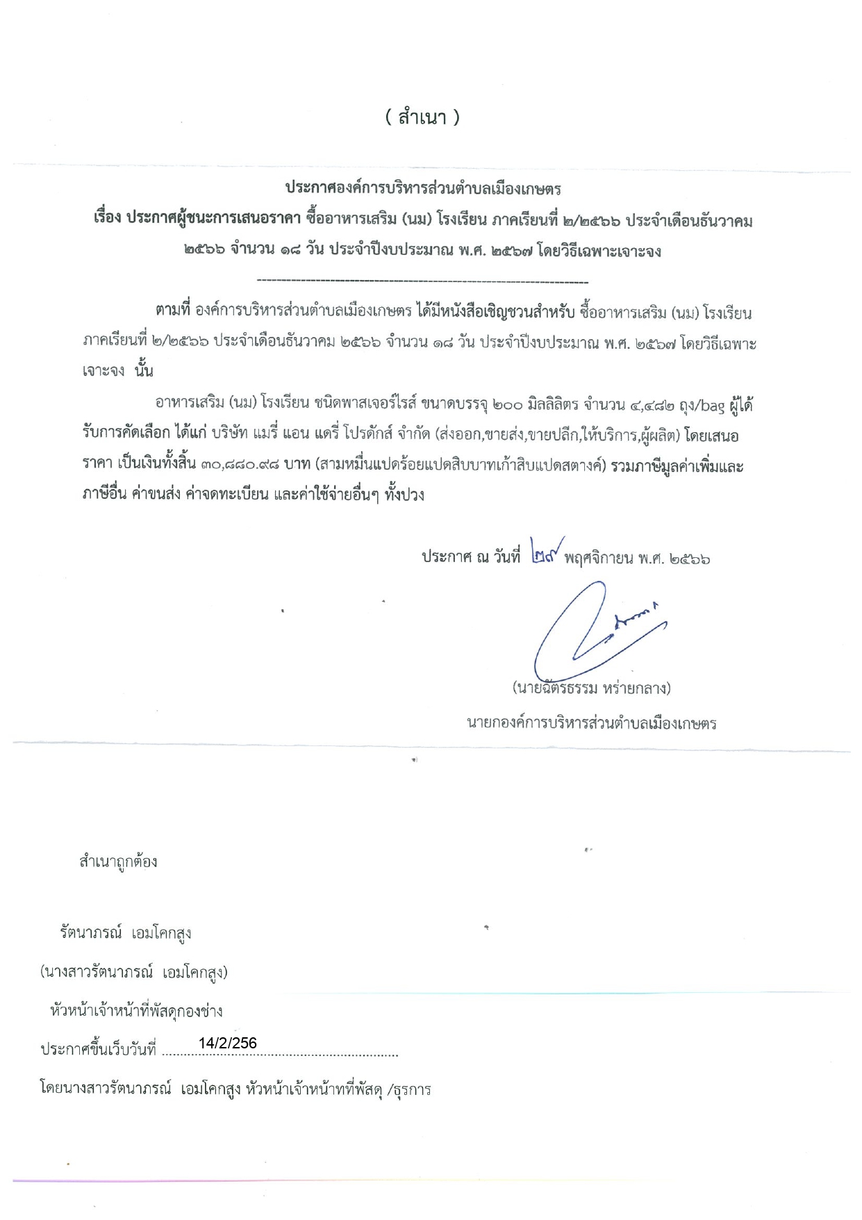 ประกาศผู้ชนะการเสนอราคา ซื้ออาหารเสริม (นม) โรงเรียน ภาคเรียนที่ 2/2566 ประจำเดือน ธันวาคม 2566