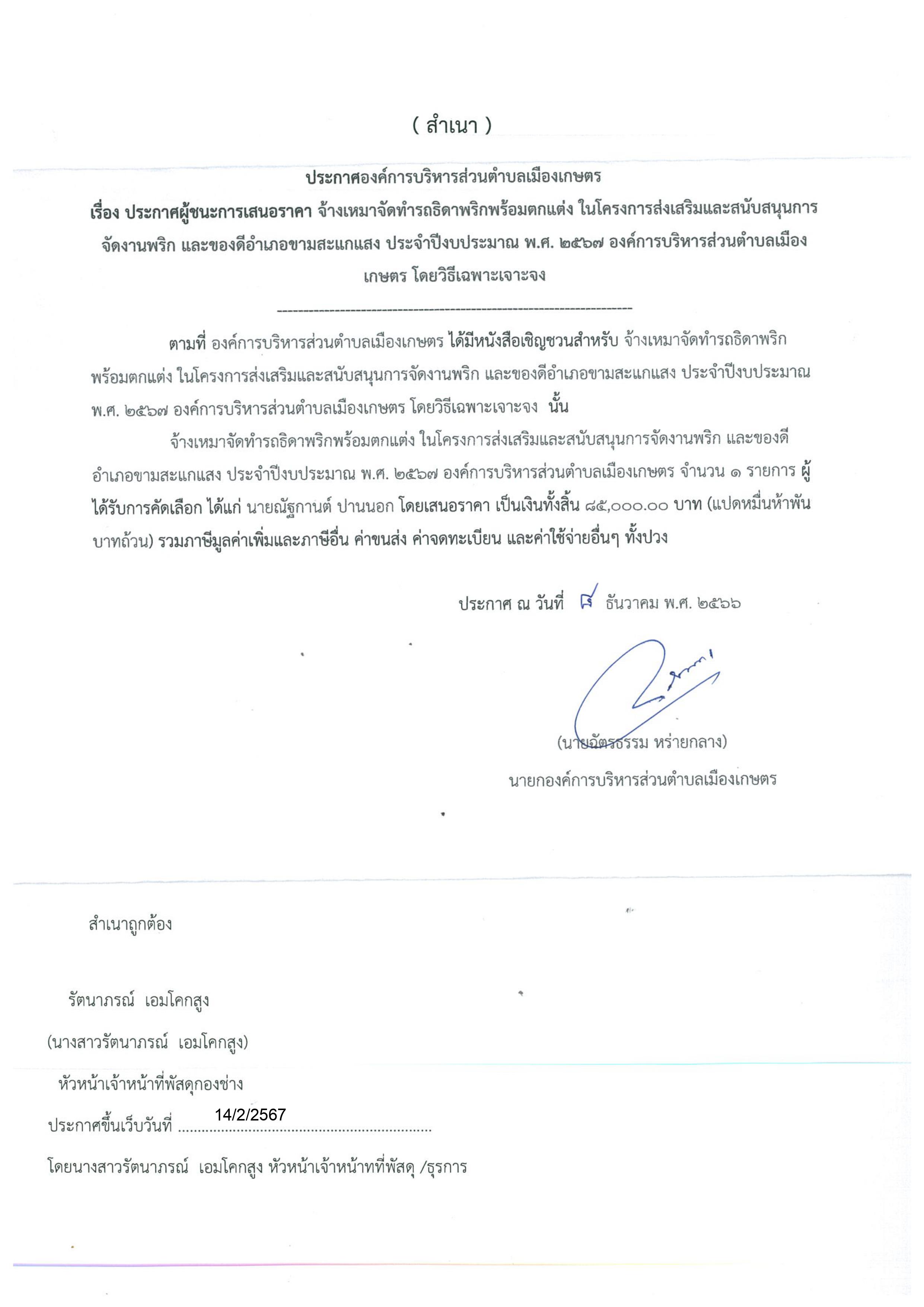 ประกาศผู้ชนะการเสนอราคาจ้างเหมาจัดทำรถธิดาพริกพร้อมตกแต่ง ในโครงการส่งเสริมและสนับสนุนการจัดงานพริก และของดีอำเภอขามสะแกแสง ประจำปีงบประมาณ 2567