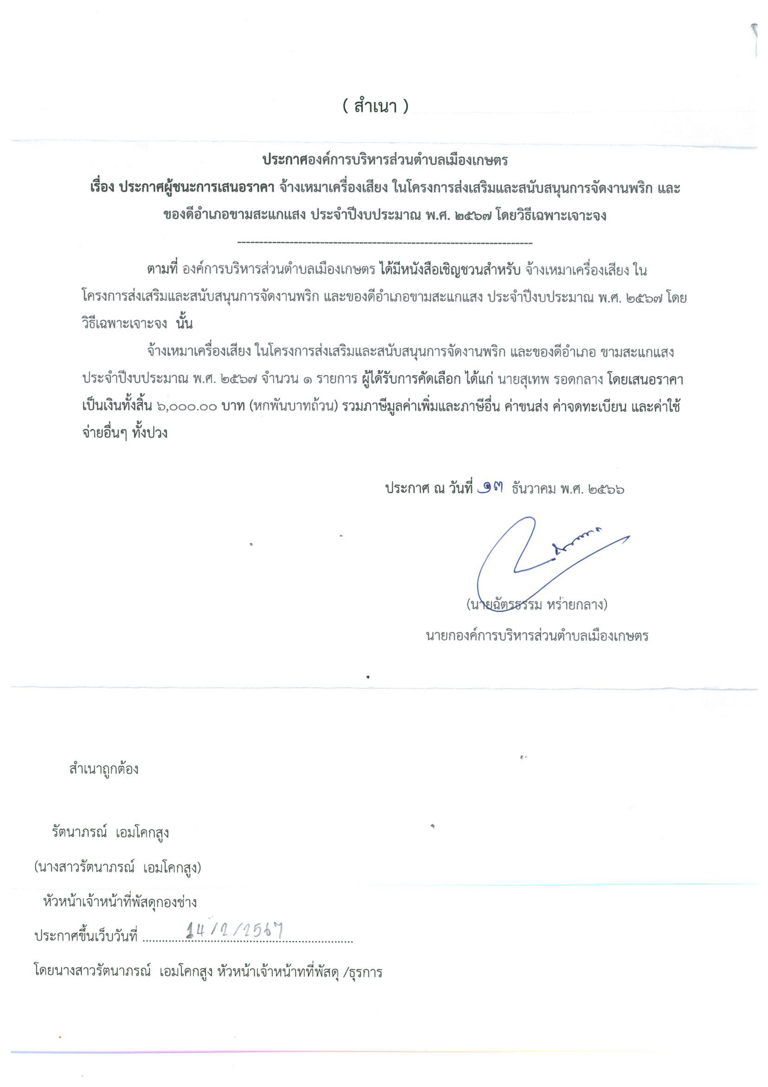 ประกาศผู้ชนะการเสนอราคา จ้างเหมาเครื่องเสียง ในโครงการส่งเสริมและสนับสนุนการจัดงานพริก และของดีอำเภอขามสะแกแสง ประจำปีงบประมาณ 2567
