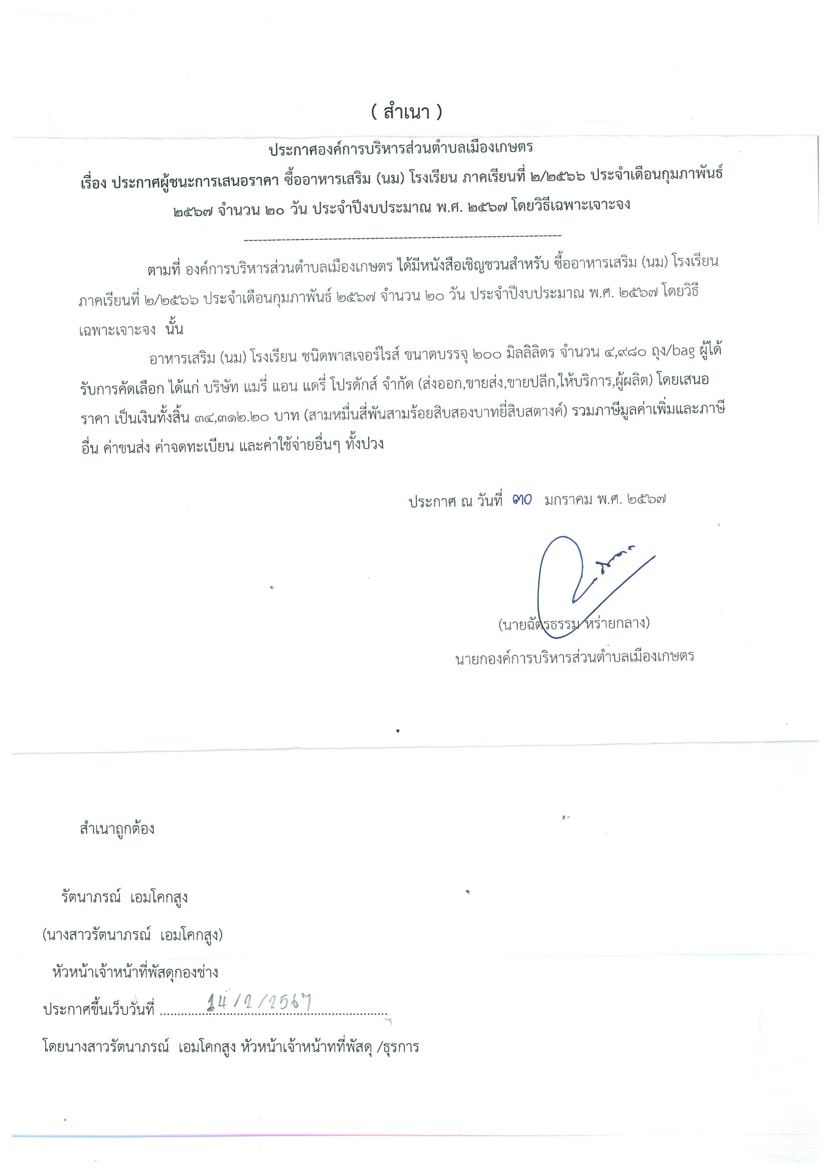 ประกาศผู้ชนะการเสนอราคา ซื้ออาหารเสริม (นม) โรงเรียน ภาคเรียน 2/2566 ประจำเดือน กุมภาพะันธ์ 2567