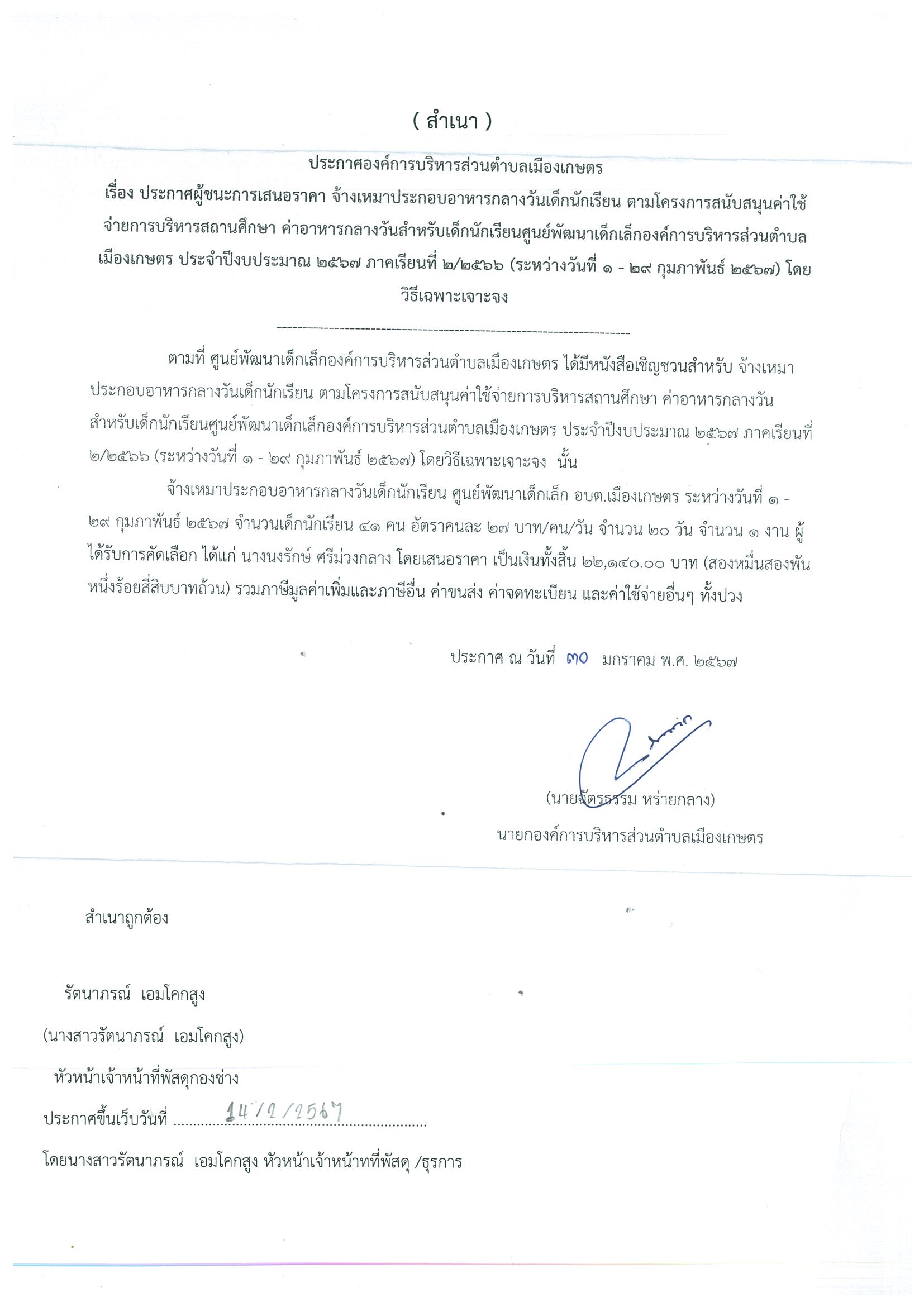 ประกาศผู้ชนะการเสนอราคา จ้างเหมาประกอบอาหารกลางวันเด็กนักเรียน ศพด.เมืองเกษตร ประจำเดือน กุมภาพันธ์ 2567