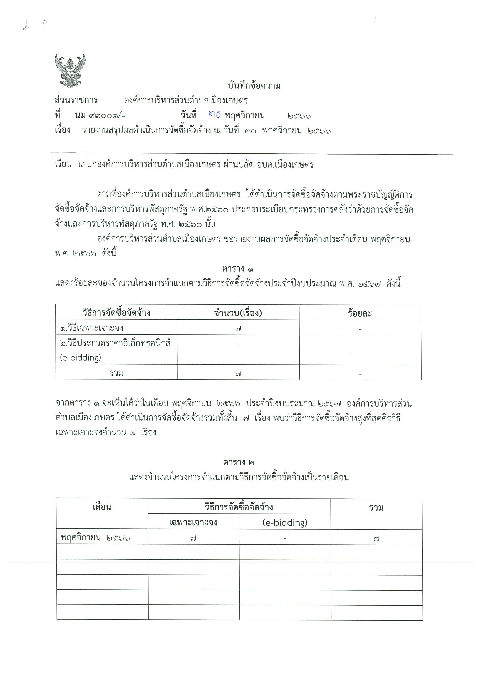 รายงานสรุปผลดำเนินการจัดซื้อจัดจ้าง ณ วันที่ 30 พ.ย. 66