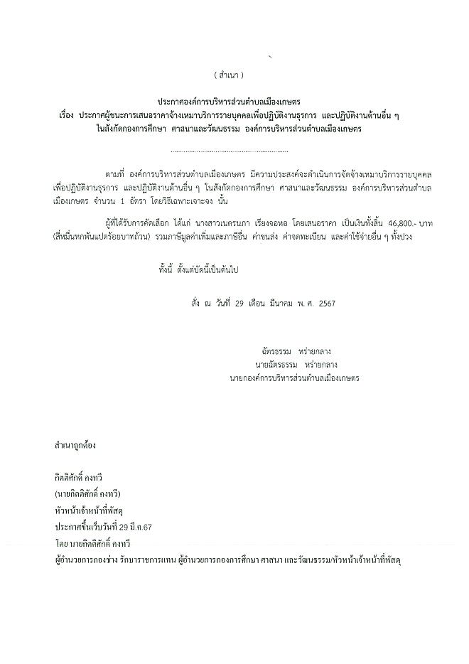 ประกาศผู้ชนะการเสนอราคาจ้างเหมาบริการรายบุคคลปฏิบัติงานธุรการในสังกัดกองการศึกษา