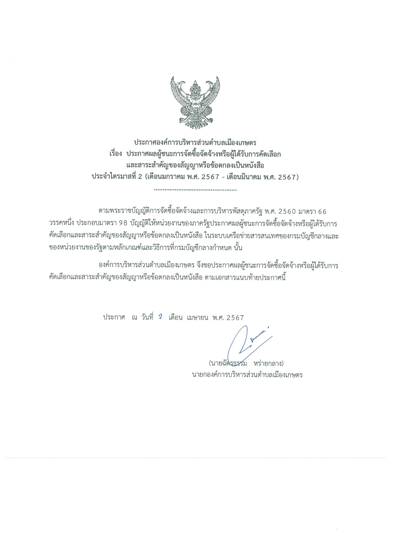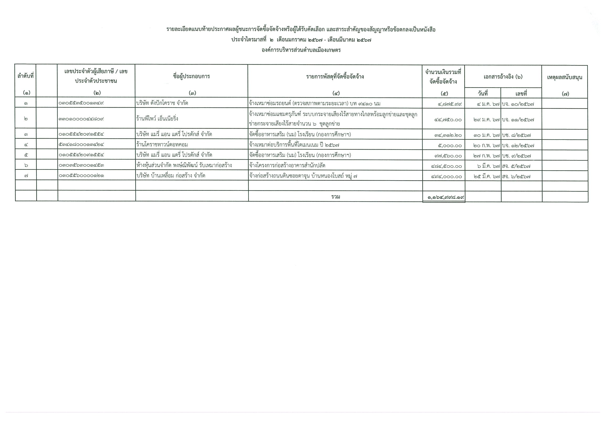 สรุปผลการจัดซื้อจัดจ้าง ประจำไตรมาสที่ 2 ปีงบประมาณ 2567