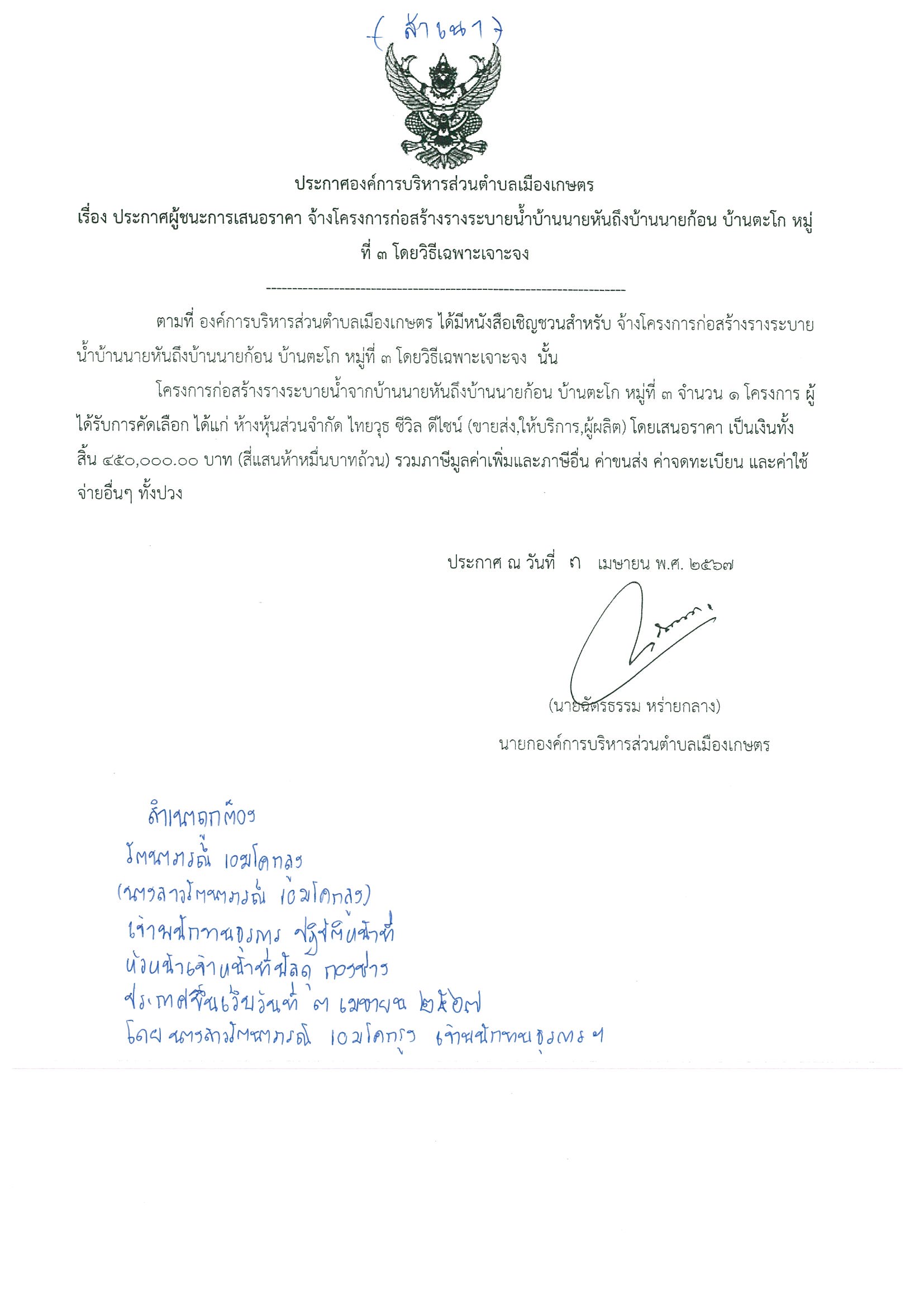 ประกาศผู้ชนะการเสนอราคาจ้างโครงการก่อสร้างรางระบายน้ำบ้านนายหันถึงบ้านนายก้อน บ้านตะโก หมู่ 3 โดยวิธีเฉพาะเจาะจง