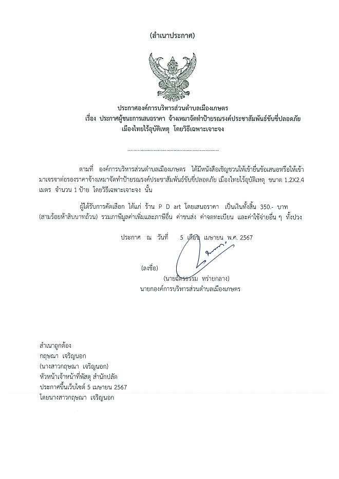 ประกาศผู้ชนะการเสนอราคาจ้างเหมาทำป้ายรณรงค์ประชาสัมพันธ์ขับขี่ปลอดภัยเมืองไทยไร้อุบัติเหตุ โดยวิธีเฉพาะเจาะจง