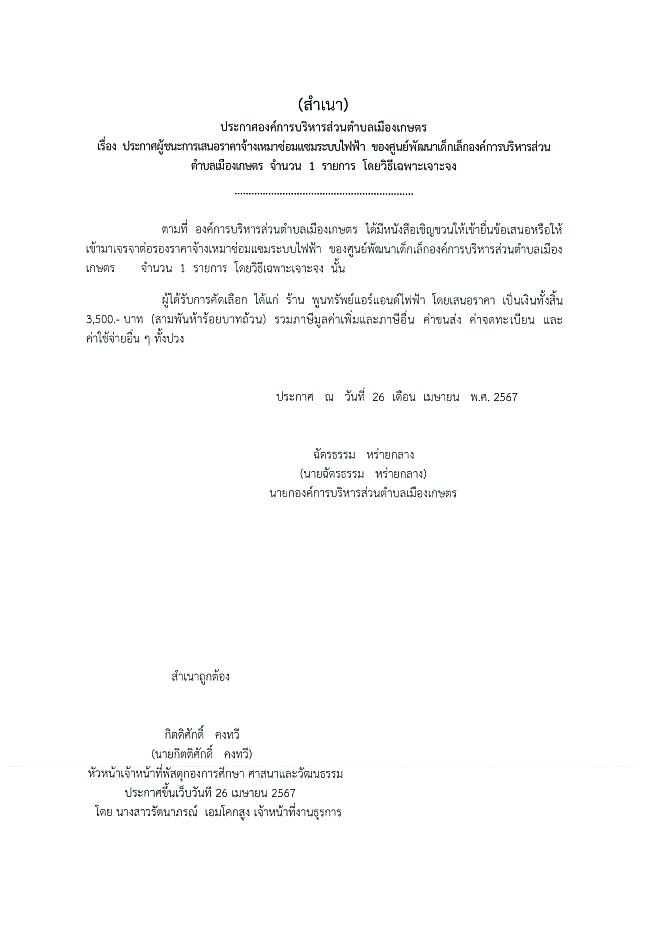 ระกาศผู้ชนะเสนอราคาจ้างเหมาซ่อมแซมระบบไฟฟ้า ศพด.เมืองเกษตร จำนวน 1 รายการ โดยวิธีเฉพาะเจาะจง