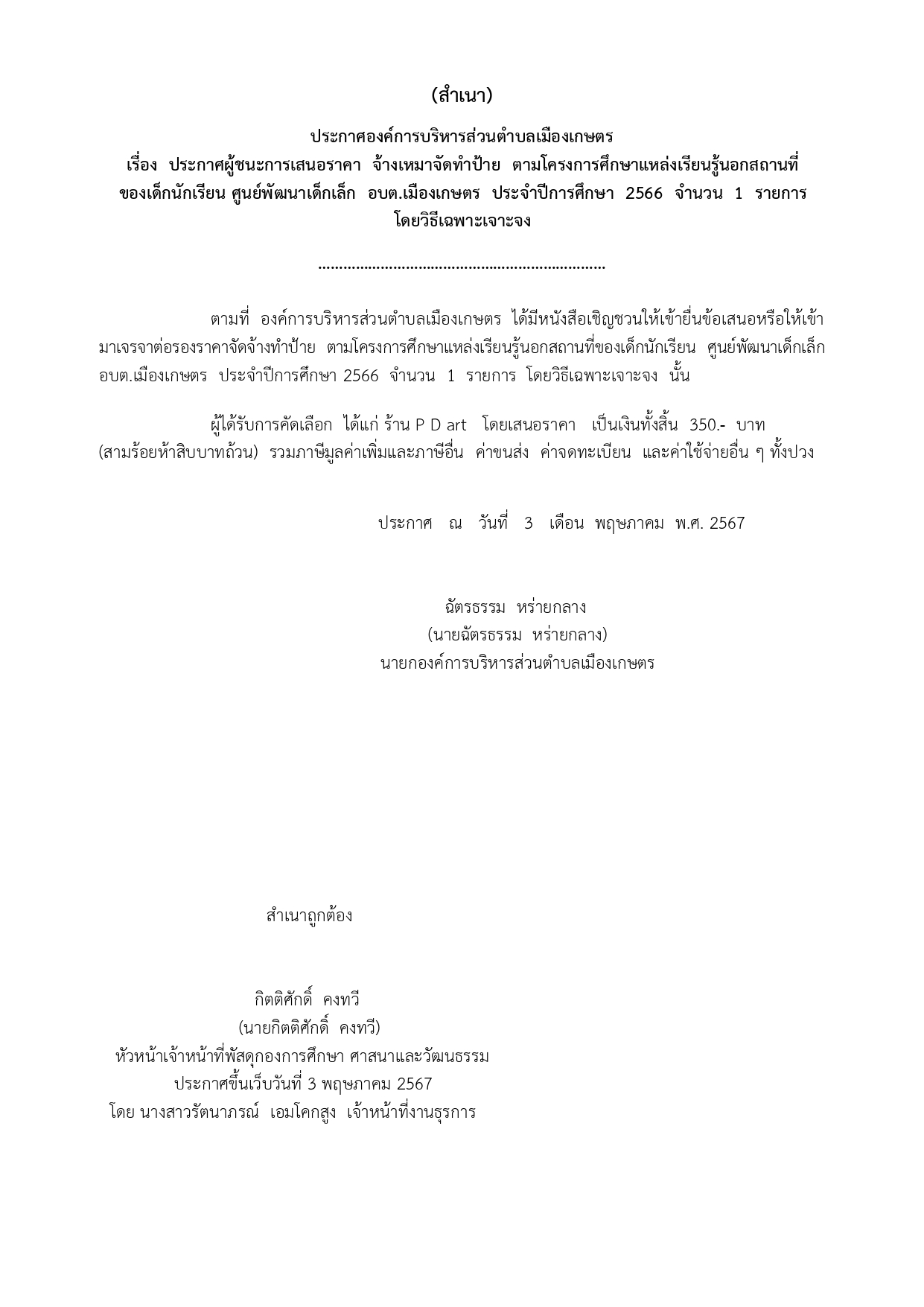 ประกาศผู้ชนะการเสนอราคา จ้างเหมาจัดทำป้าย ตามโครงการศึกษาแหล่งเรียนรู้นอกสถานที่ ของเด็กนักเรียน ศูนย์พัฒนาเด็กเล็ก อบต.เมืองเกษตร ประจำปีการศึกษา 2566 จำนวน 1 รายการ โดยวิธีเฉพาะเจาะจง