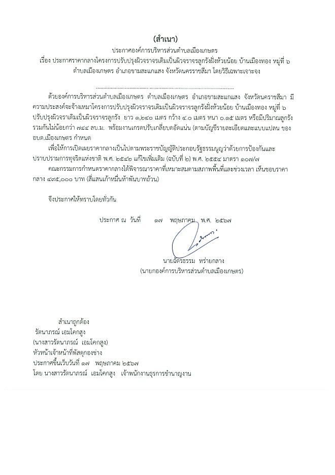 ประกาศราคากลาง โครงการปรับปรุงผิวจราจรเดิมเป็นผิวจราจรลูกรังฝั่งห้วยน้อย บ้านเมืองทอง หมู่ที่ 6 โดยวิธีเฉพาะเจาะจง