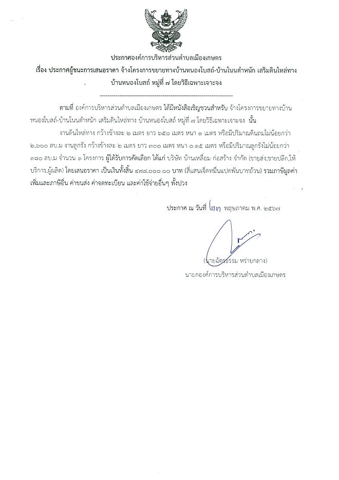ประกาศผู้ชนะการเสนอราคาก่อสร้างโครงการขยายทางบ้านหนองโบสถ์-บ้านโนนตำหนัก เสริมดินไหล่ทาง บ้านหนองโบสถ์ หมู่ที่ 7