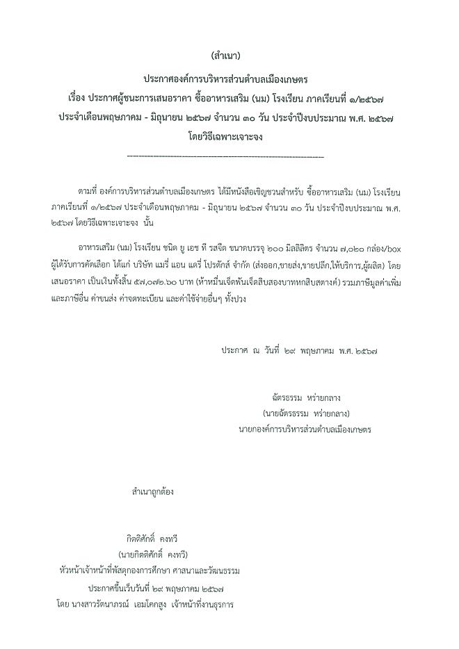 ประกาศผู้ชนะการเสนอราคา ซื้ออาหารเสริม(นม) โรงเรียน ภาคเรียนที่1/2567 ประจำเดือน พ.ค.-มิ.ย.2567 โดยวิธีเฉพาะเจาะจง