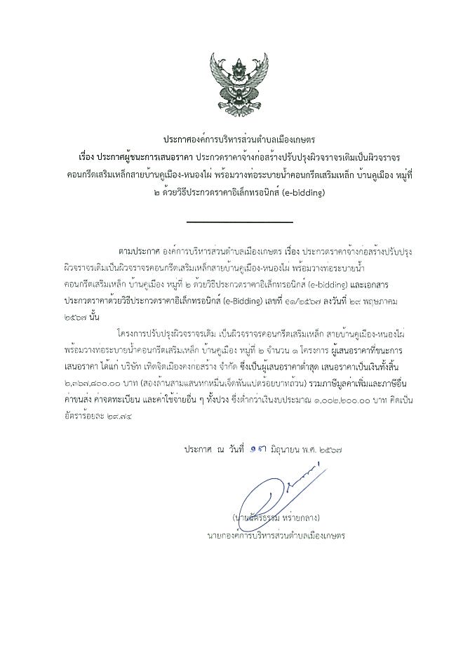 ประกาศผู้ชนะการเสนอราคาประกวดราคาจ้างก่อสร้างปรับปรุงผิวจราจรเดิมเป็นผิวจราจรคอนกรีตเสริมเหล็กสายบ้านคูเมือง-หนองไผ่ พร้อมวางท่อระบายน้ำคอนกรีตเสริมเหล็ก บ้านคูเมือง หมู่ที่ ๒ ด้วยวิธีประกวดราคา