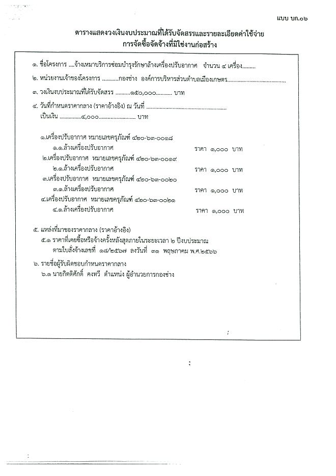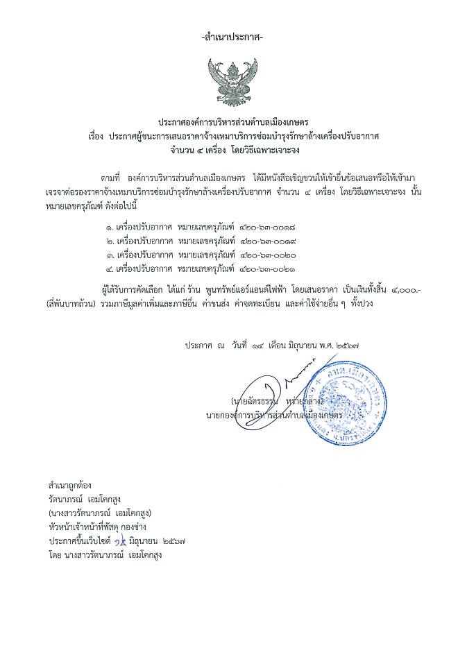 ประกาศผู้ชนะการเสนอราคาจ้างเหมาบริการซ่อมบำรุงล้างเครื่องปรับอากาศ จำนวน 4 เครื่อง โดยวิธีเฉพาะเจาะจง