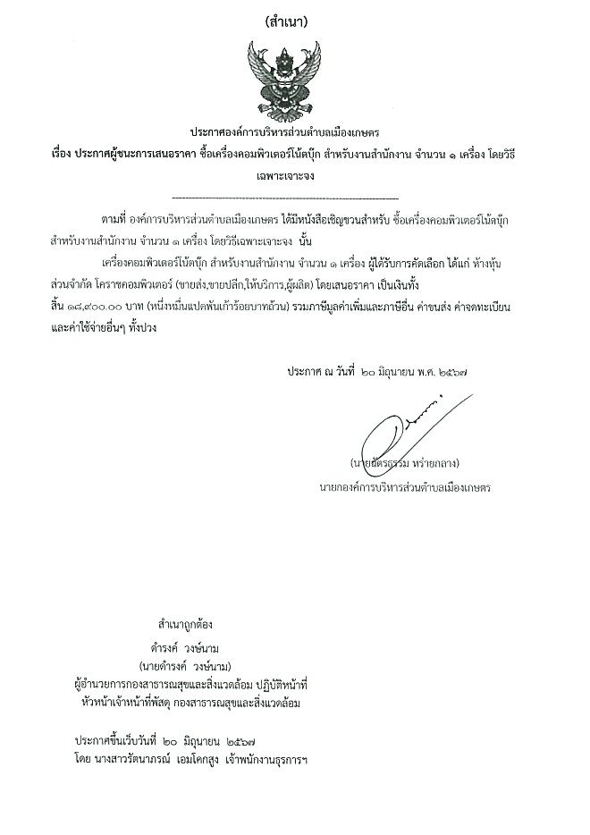 ประกาศผู้ชนะการเสนอราคาซื้อเครื่องคอมพิวเตอร์สำหรับงานสำนักงาน 1 เครื่อง โดยวิธีเฉพาะเจาะจง