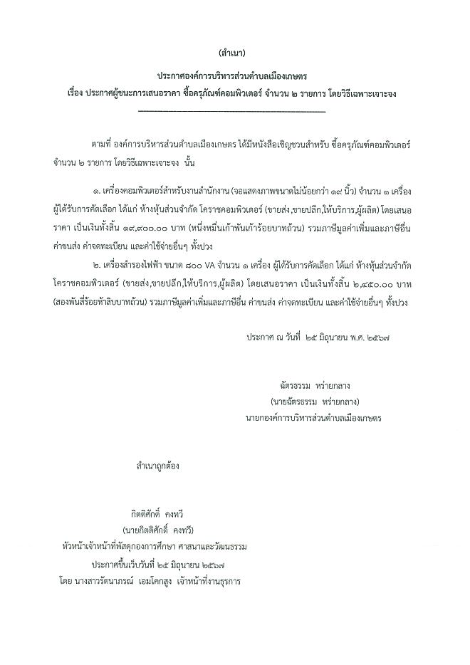 ประกาศผู้ชนะการเสนอราคาซื้อครุภัณฑ์คอมพิวเตอร์ 2 รายการ โดยวิธีเฉพาะเจาะจง