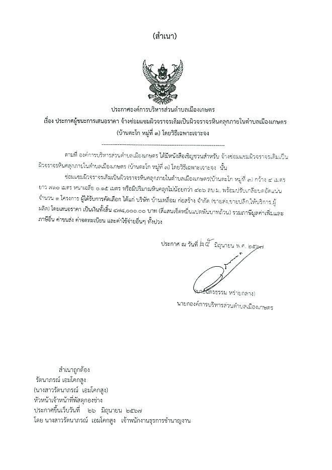 ประกาศผู้ชนะการเสนอราคาจ้างซ่อมแซมผิวจราจรเดิมเป็นผิวจราจรหินคลุกบ้านตะโก หมู่ 3 โดยวิธีเฉพาะเจาะจง