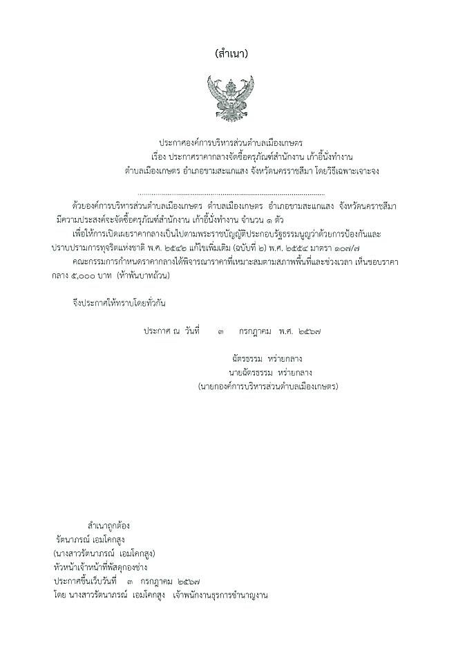 ประกาศราคากลางจัดซื้อครุภัณฑ์สำนักงาน เก้าอี้นั่งทำงาน