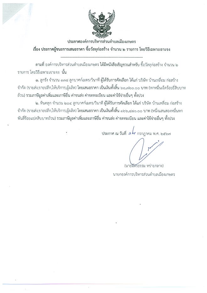 ประกาศผู้ชนะการเสนอราคาซื้อวัสดุก่อสร้าง