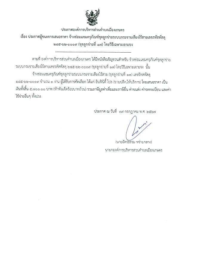 ประกาศผู้ชนะการเสนอราคา จ้างซ่อมแซมครุภัณฑ์ชุดลูกข่ายระบบกระจายเสียงไร้สาย (ชุดลูกข่ายทึ่ 17) โดยวิธีเฉพาะเจาะจง