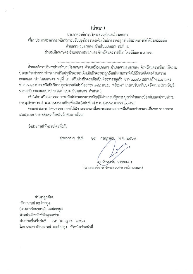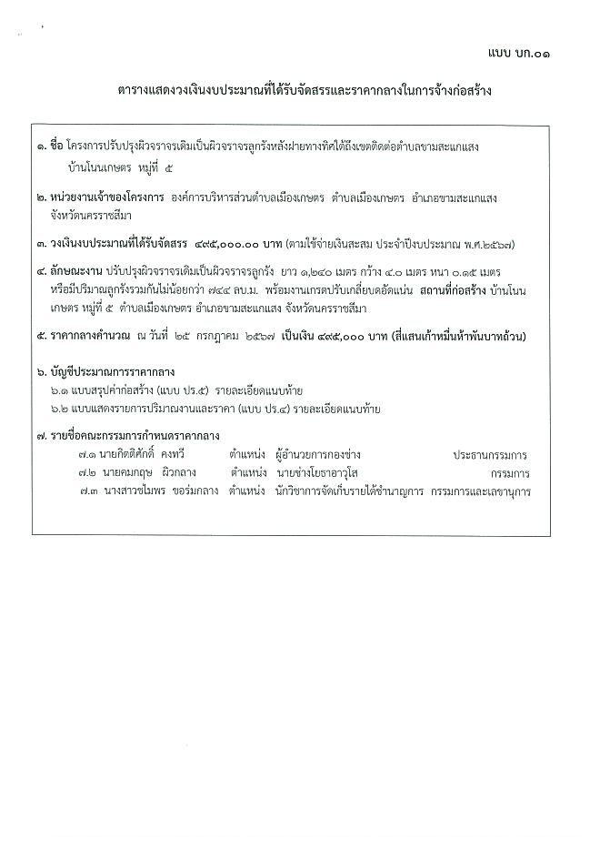 ประกาศราคากลางโครงการปรับปรุงผิวจราจรเดิมเป็นผิวจราจรลูกรังหลังฝายทิศใต้ถึงเขตติดต่อ ต.ขาม โนนเกษตร ม.5