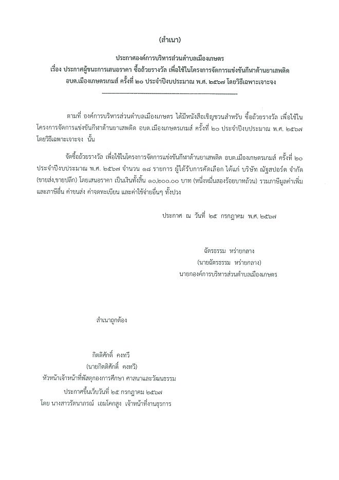ประกาศผู้ชนะเสนอราคา ซื้อถ้วยรางวัล เพื่อใช้ในโครงการแข่งขันกีฬาอบต.เมืองเกษตรเกมส์ ครั้งที่ 20 โดยวิธีเฉพาะเจาะจง