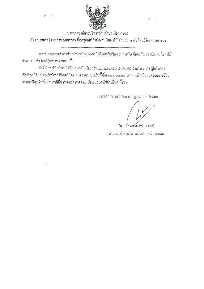 ประกาศผู้ชนะเสนอราคา ซื้อครุภัณฑ์สำนักงาน โซฟาไม้ จำนวน 3 ตัว โดยวิธีเฉพาะเจาะจง