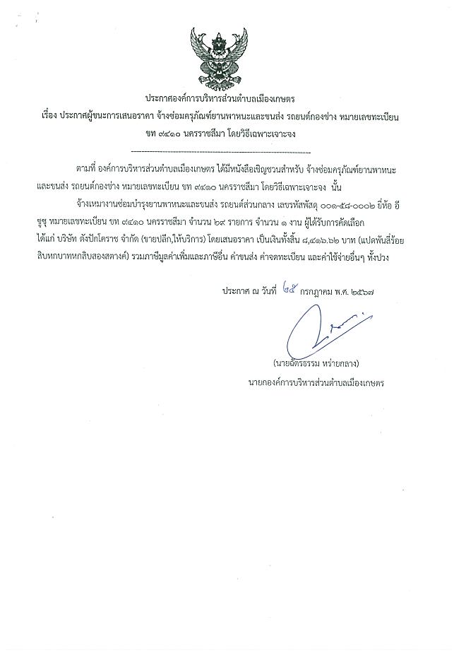 ประกาศผู้ชนะเสนอราคาจ้างซ่อมครุภัณฑ์รถยนต์กองช่างทะเบียน ขท 9410