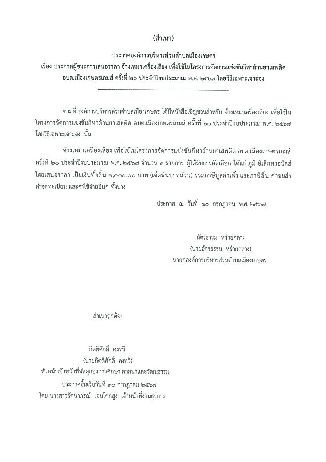 ประกาศผู้ชนะเสนอราคา จ้างเหมาเครื่องเสียง เพื่อใช้ในโครงการแข่งขันกีฬาอบต.เมืองเกษตรเกมส์ ครั้งที่ 20 โดยวิธรเฉพา่ะเจาะจง
