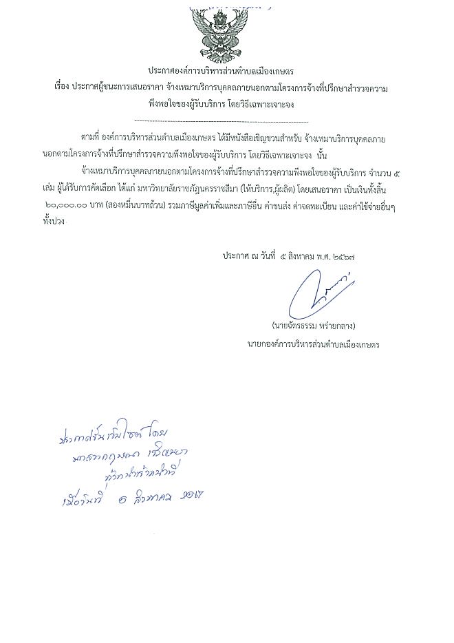 ประกาศผู้ชนะเสนอราคาจ้างเหมาบริการบุคคลภายนอกตามโครงการจ้างที่ปรึกษาสำรวจความพึงพอใจของผู้รับบริการโดยวิธีเฉพาะเจาะจง