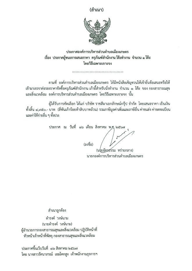 ประกาศผู้ชนะเสนอราคาครุภัณฑ์สำนักงานโต๊ะทำงานจำนวน1โต๊ะ