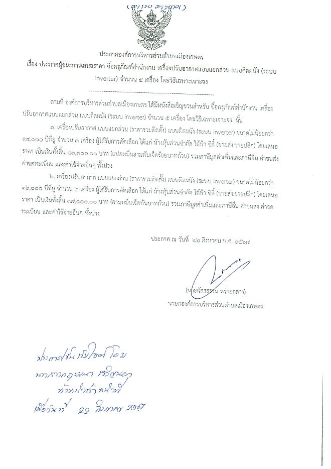 ประกาศผู้ชนะเสนอราคา ซื้อครุภัณฑ์สำนักงาน เครื่องปรับอากาศแบบแยกส่วน แบบติดผนังจำนวน 5 เครื่องโดยวิธีเฉพาะเจาะจง