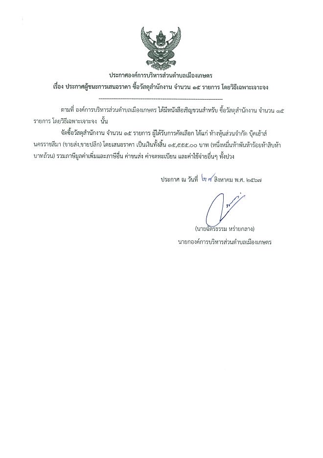 ประกาศผู้ชนะเสนอราคาวัสดุสำนักงาน (กองช่าง) โดยวิธีเฉพาะเจาะจง