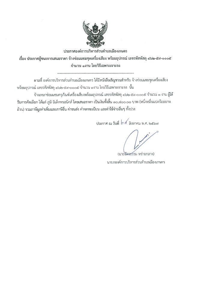 ประกาศผู้ชนะเสนอราคาซ่อมแซมชุดเครื่องเสียงพร้อมอุปกรณ์ โดยวิธีเฉพาะเจาะจง